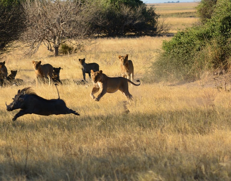 The longer route carries you through Botswana’s great wilderness contrasts. From the water filled channels of the Okavango Delta to the wild corridors of Khwai, across the open stretches of Mababe, and into the raw predator country of Savuti. Each region holds a different intensity. Delta mornings unfold in stillness and reflected light. Khwai’s floodplains feel alive with lechwe, elephant and prowling lion. Mababe opens wide and ancient beneath endless sky. In Savuti, the air carries a quiet tension where lion, hyena and elephant move through territories shaped by survival.